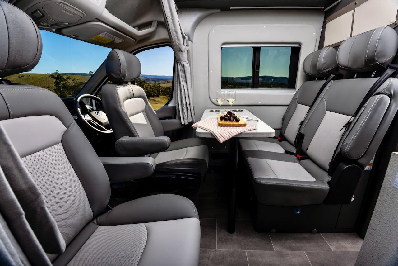 When the vehicle is parked, the front seats can swivel to face the rear to create a lounge area, while the Deliver 9 camper also features a stowable dining table, window shades, and a fly screen for the sliding door.