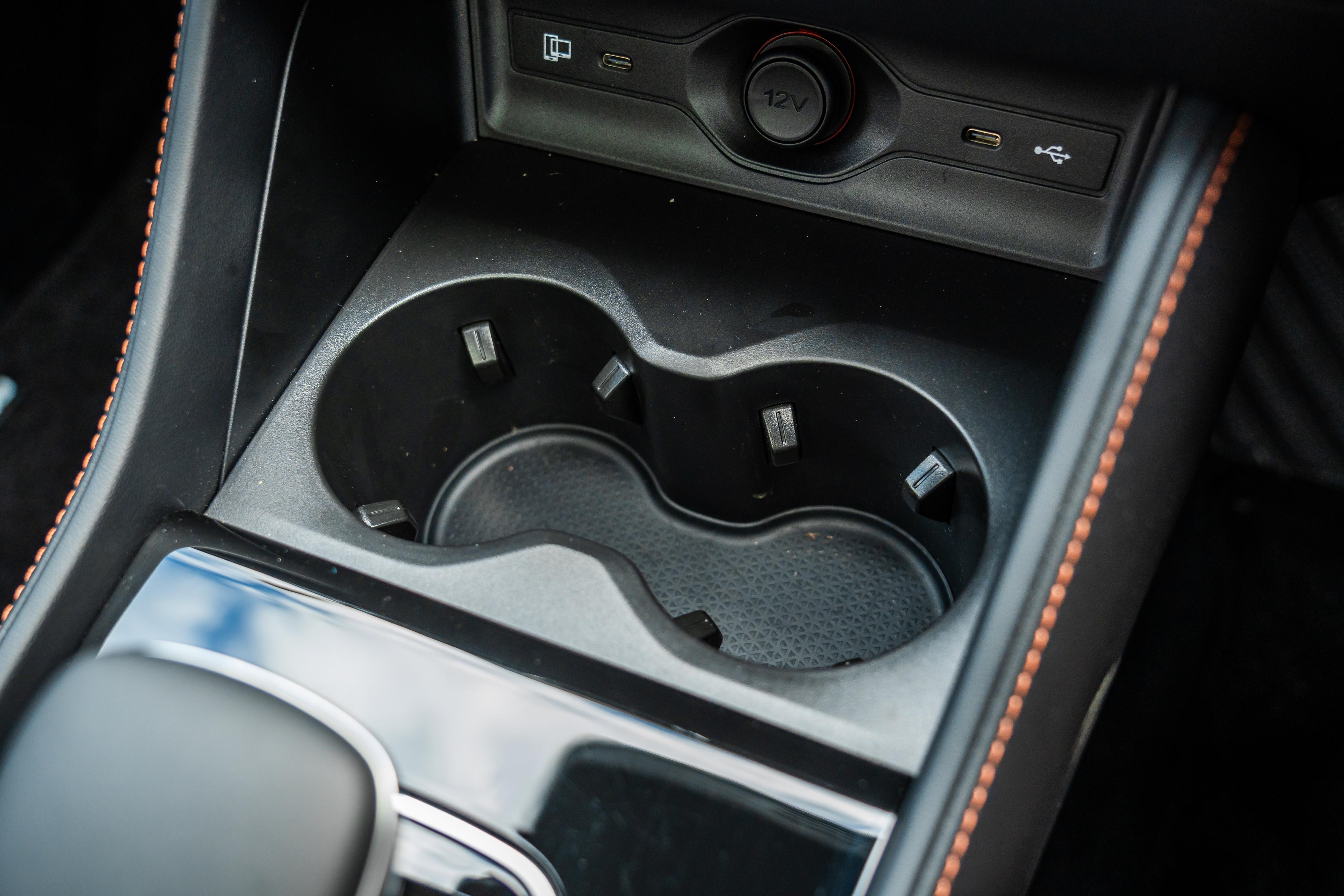 There are toothed cupholders ahead of the e-shifter and a grippy rubberised phone slot housing a wireless charger, which are handy. But if you use the USB ports for your phone you’ll have wires running along the centre console, because there’s nowhere to put your phone ahead of the cupholders.