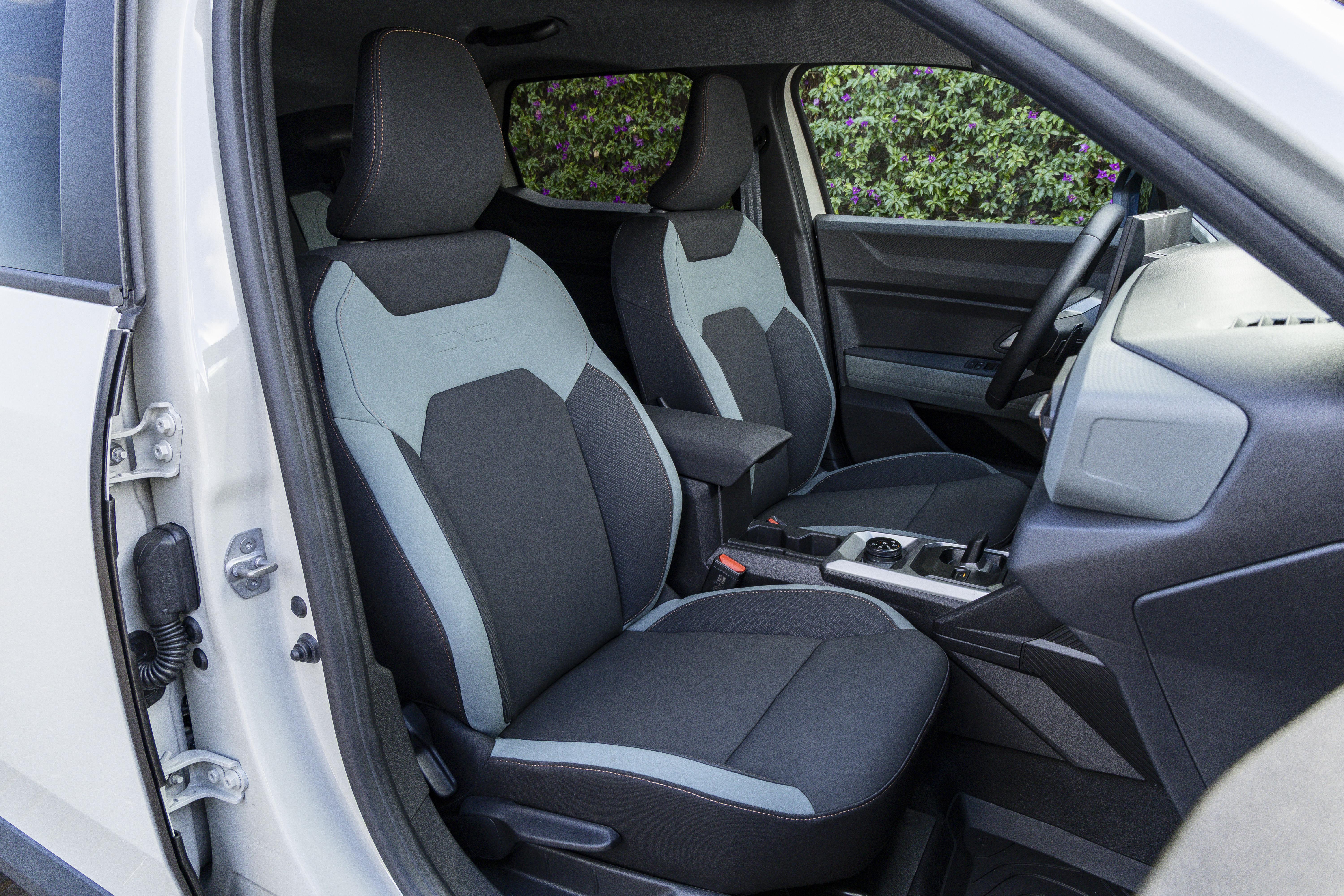 The driver and front passenger seats are manually adjustable, and the steering wheel can be adjusted for reach and rake.