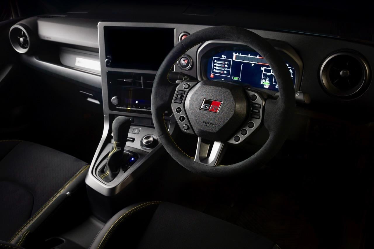 Inside, the cabin features suede with yellow stitching on a GR steering wheel, exclusive seats with yellow stitching, and a Morizo mode on the digital instrument cluster.