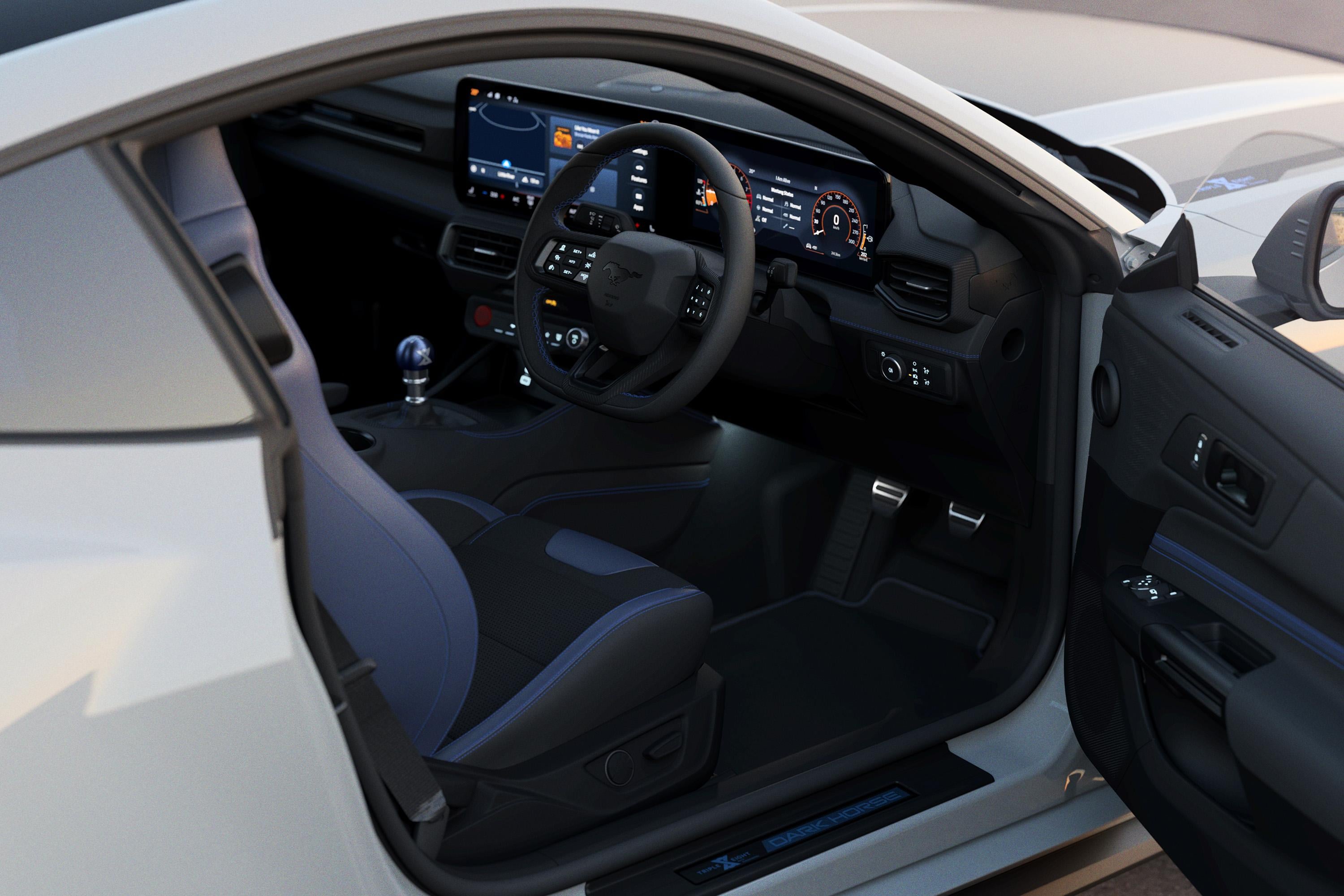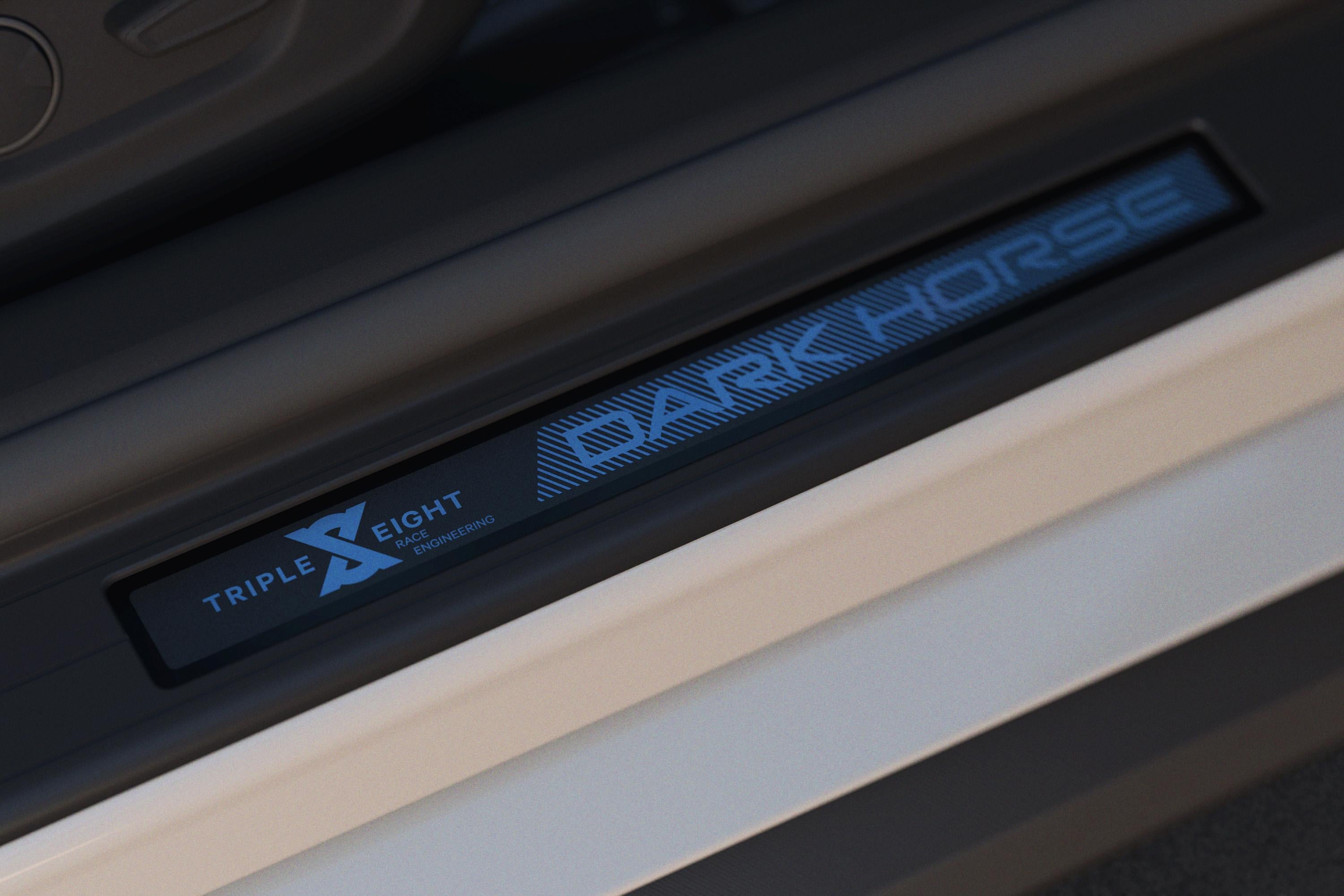 Inside, Triple Eight scuff plates, blue door trim accents, and a blue-accented gear selector with T8 branding are fitted, while standard Recaro sports seats feature blue bolsters. These Recaro sports seats are a $3835 option on the regular Dark Horse.